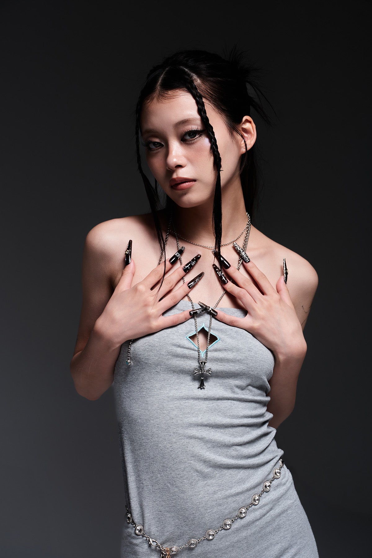 胸元にダイヤモンドカットが入ったベアトップタイトワンピース。