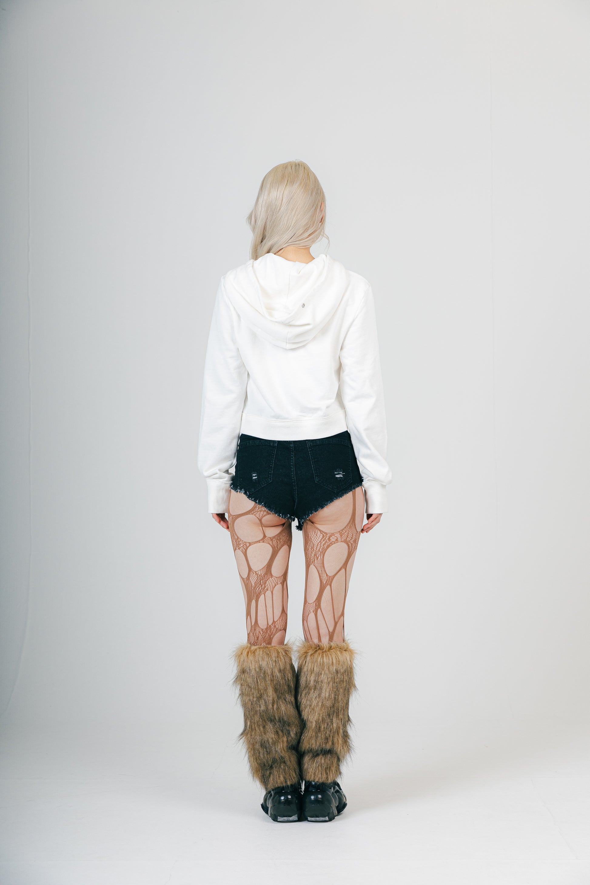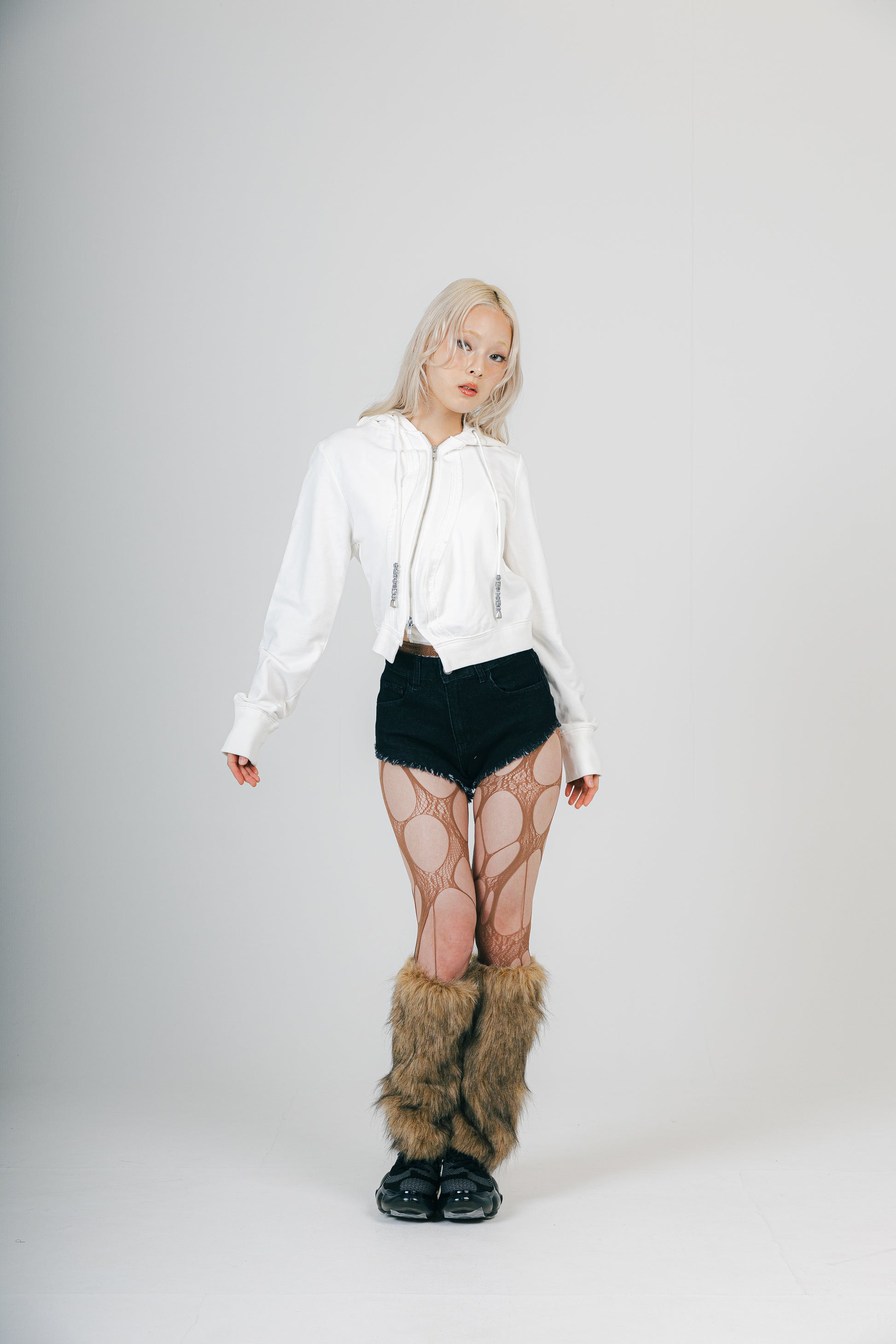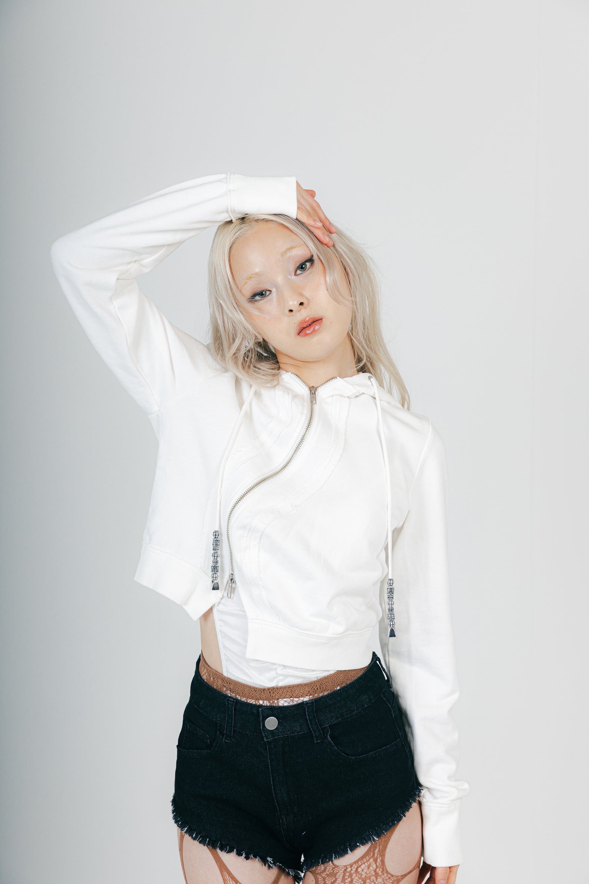 アシンメトリーなウェーブジップがモードな印象を与えるクロップドパーカー。