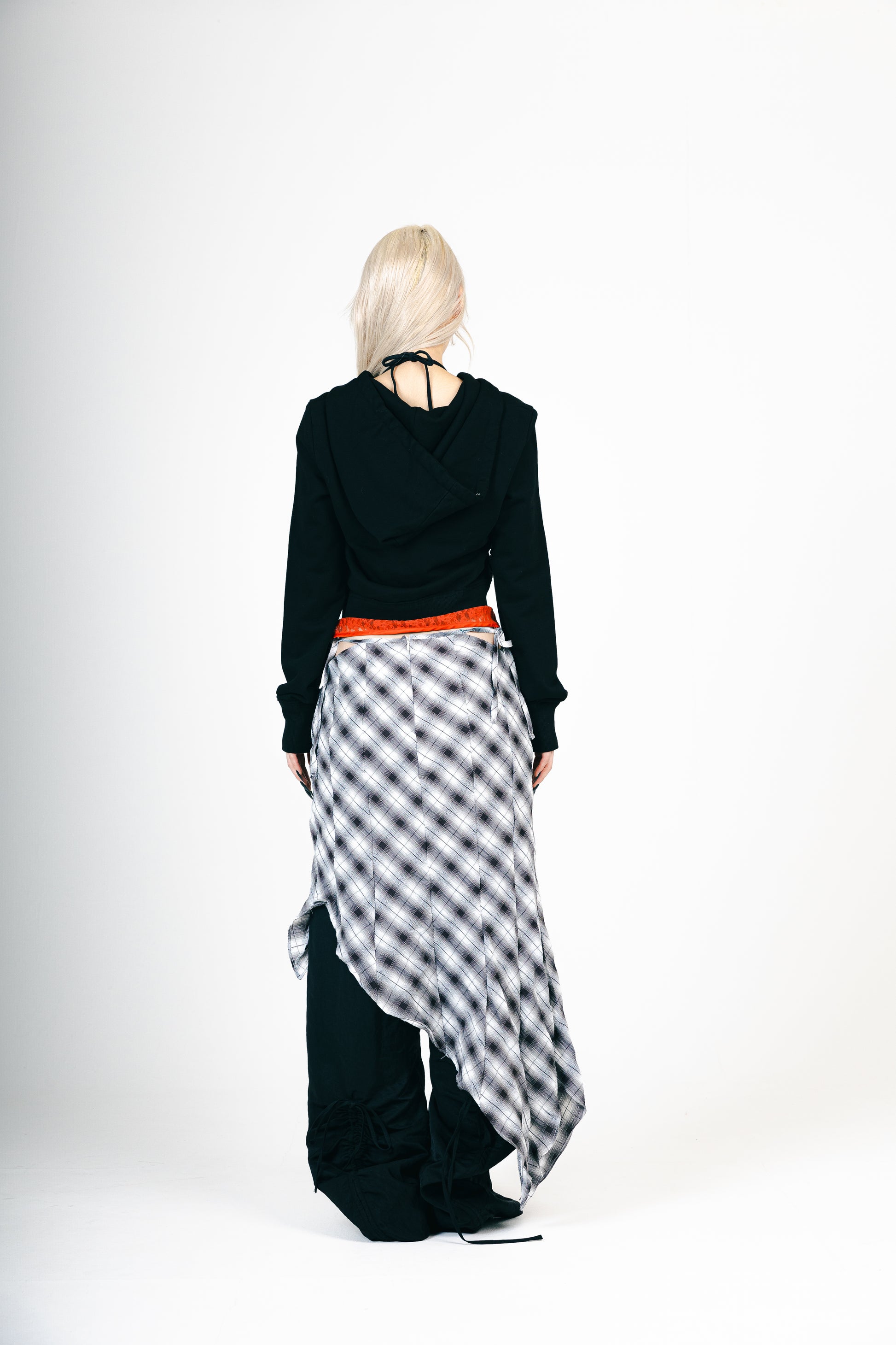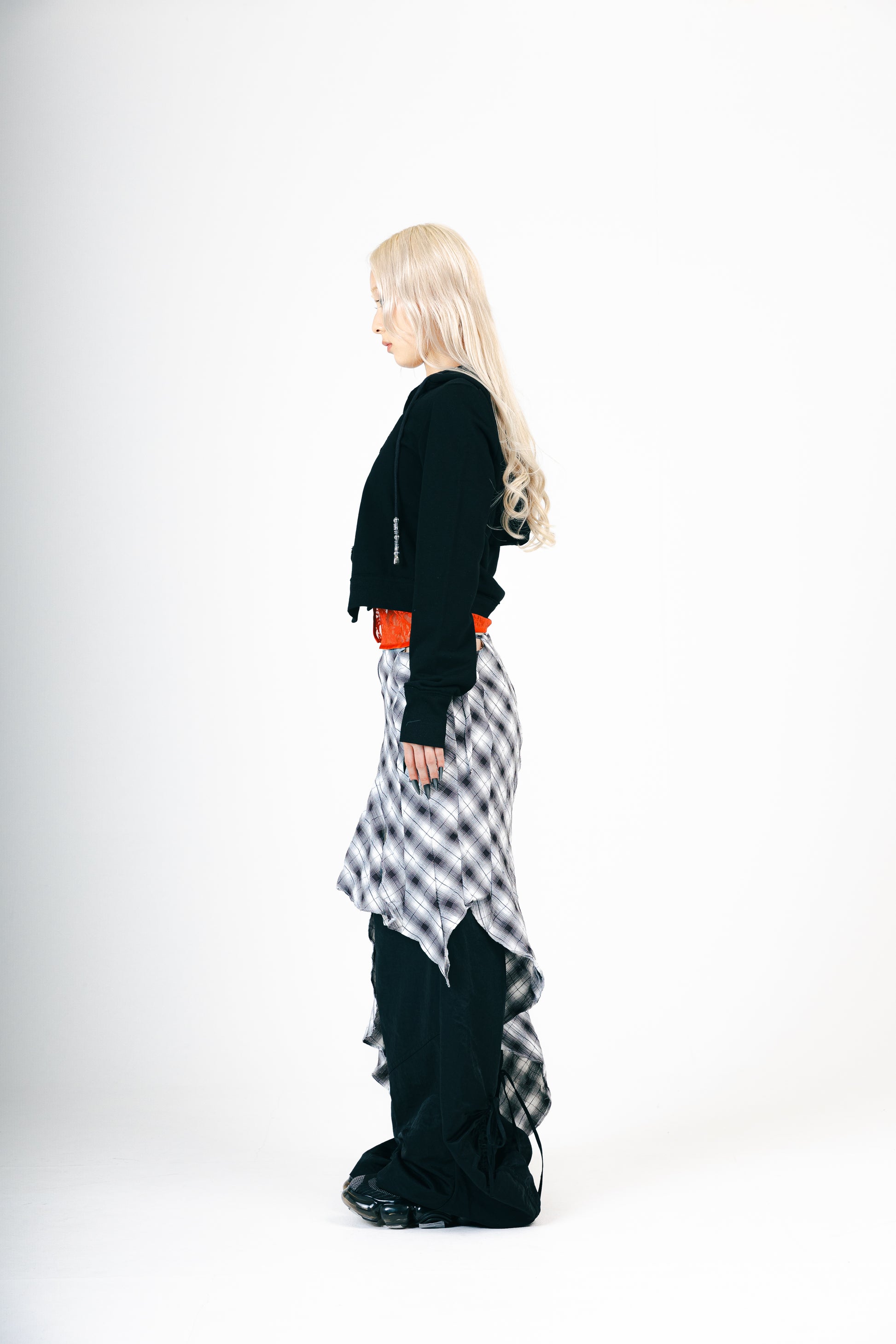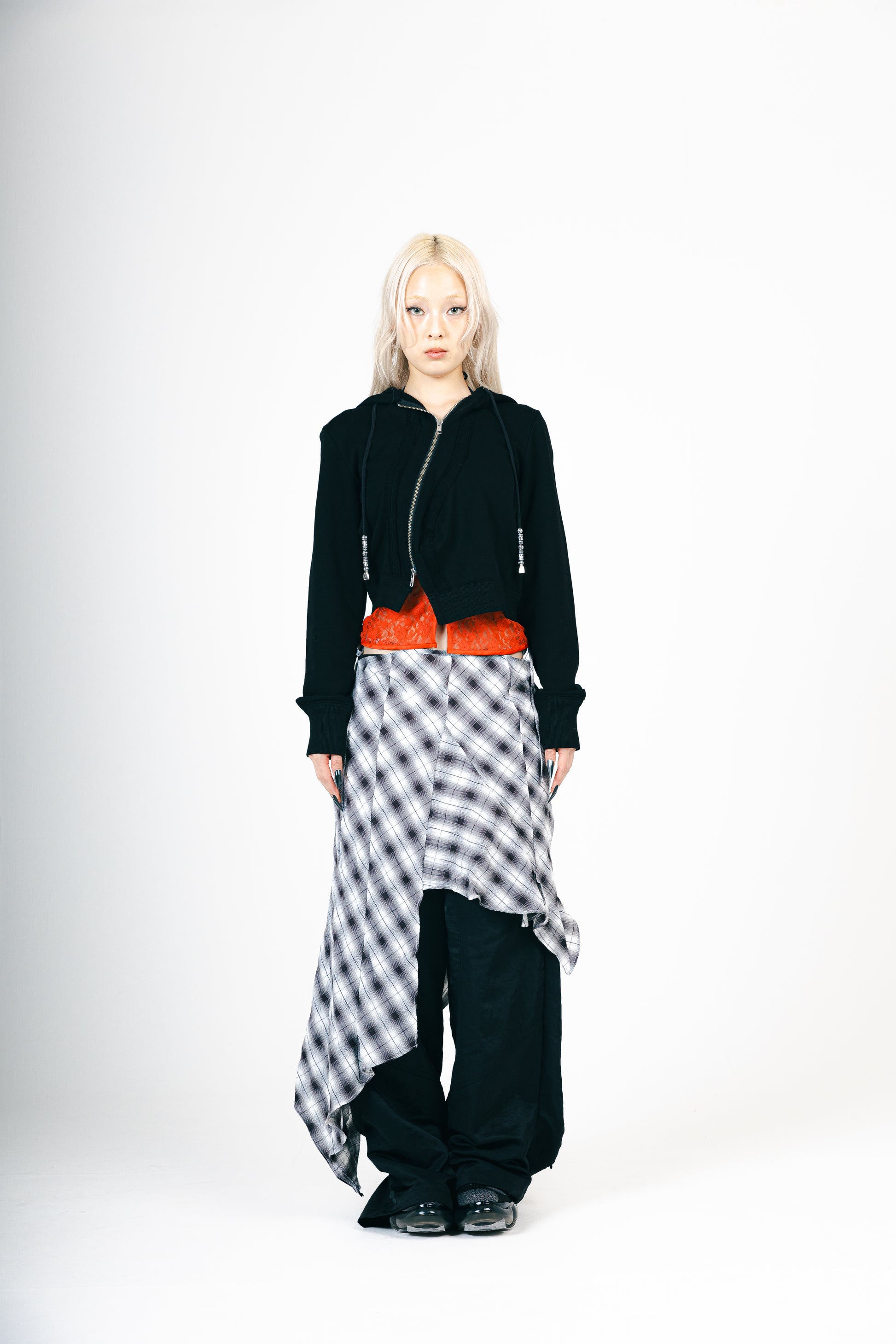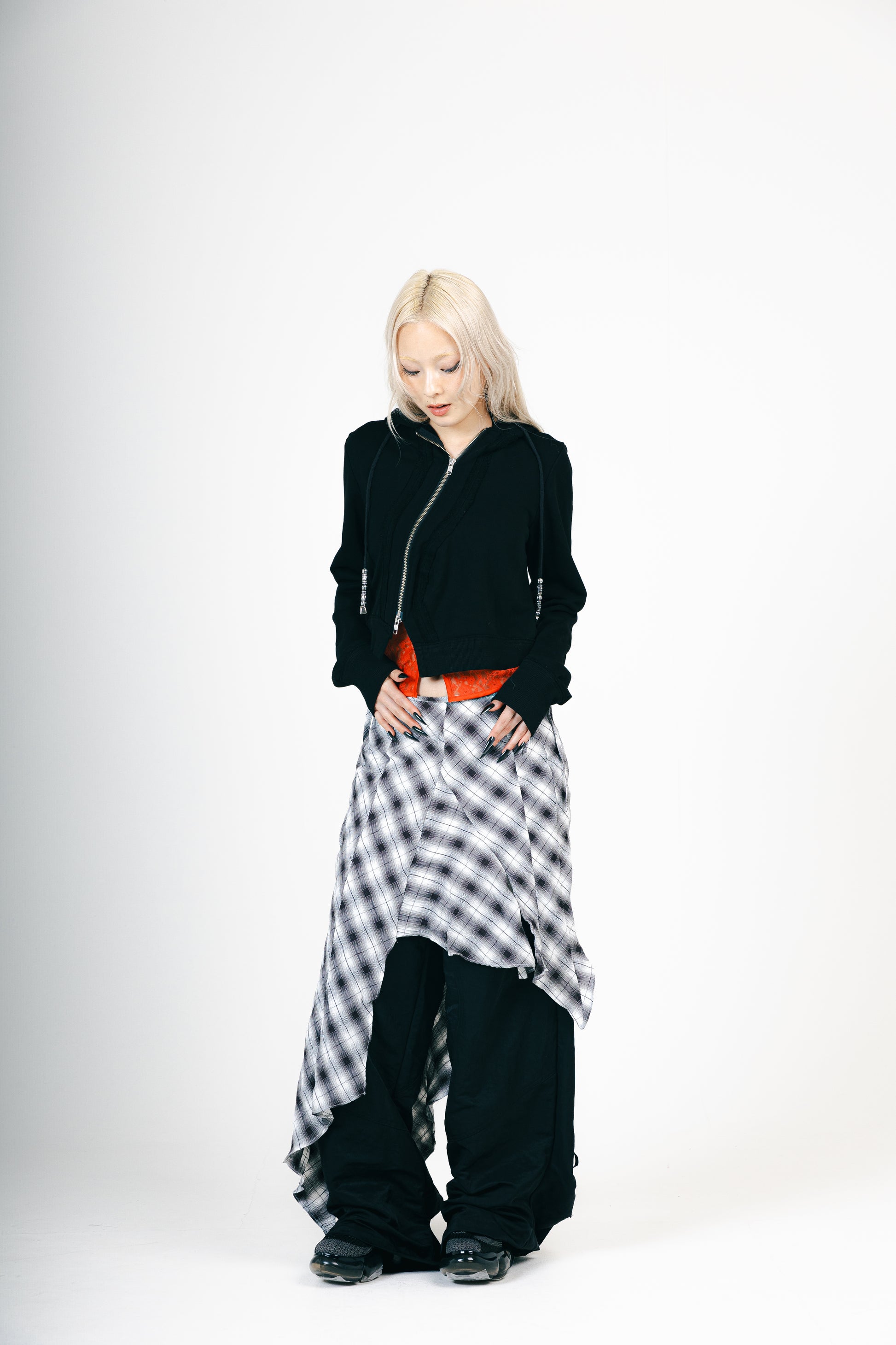 アシンメトリーなウェーブジップがモードな印象を与えるクロップドパーカー。