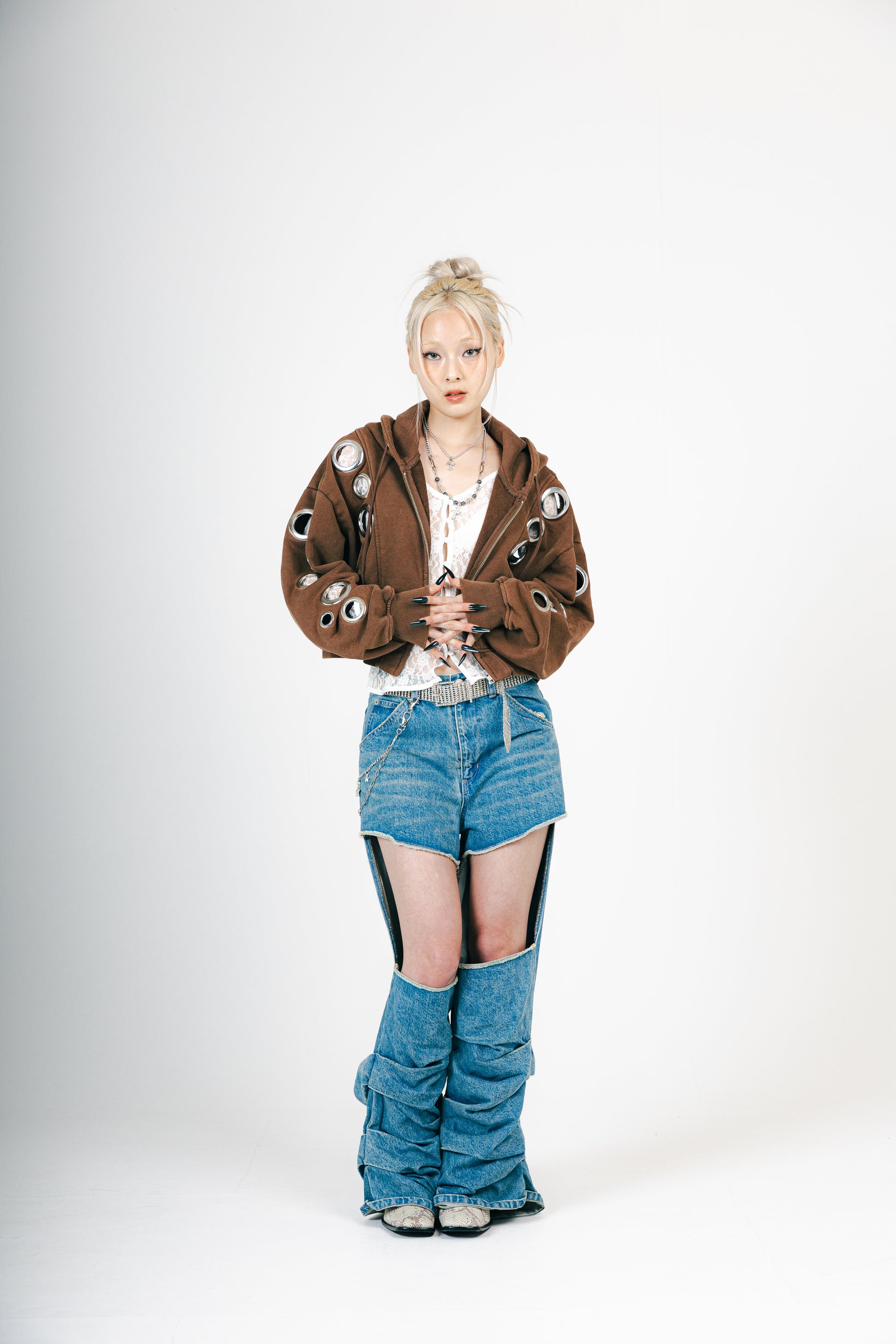 インパクトのある大きなアイレットが目を引くクロップドフーディ。